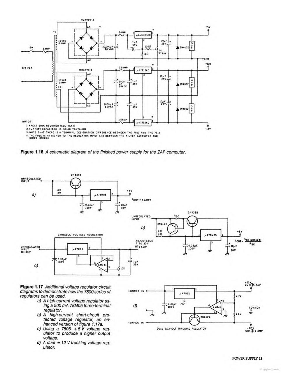 The ZAP computer required three DC voltage rails: +5V at 5 amps for the digital logic, and ±12V at 1 amp each for peripheral interfaces and analog circuits. Ciarcia devoted an entire chapter to power supply design, explaining transformer selection, full-wave bridge rectification, filter capacitor sizing, and three-terminal voltage regulators.
