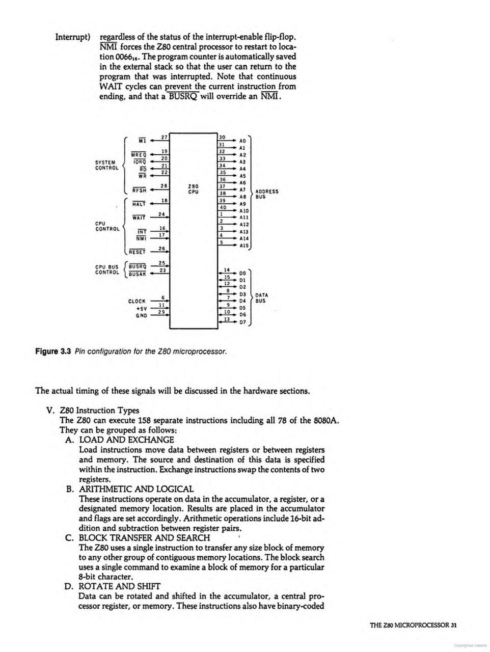Ciarcia also explained the hardware interface: the meaning of every pin on the Z80's 40-pin package. Control signals like MREQ (memory request), IORQ (I/O request), RD (read), WR (write), and RFSH (refresh) are described in terms of their logical function and timing relationships. The interrupt system, with its three modes and maskable/non-maskable hierarchy, receives thorough treatment.