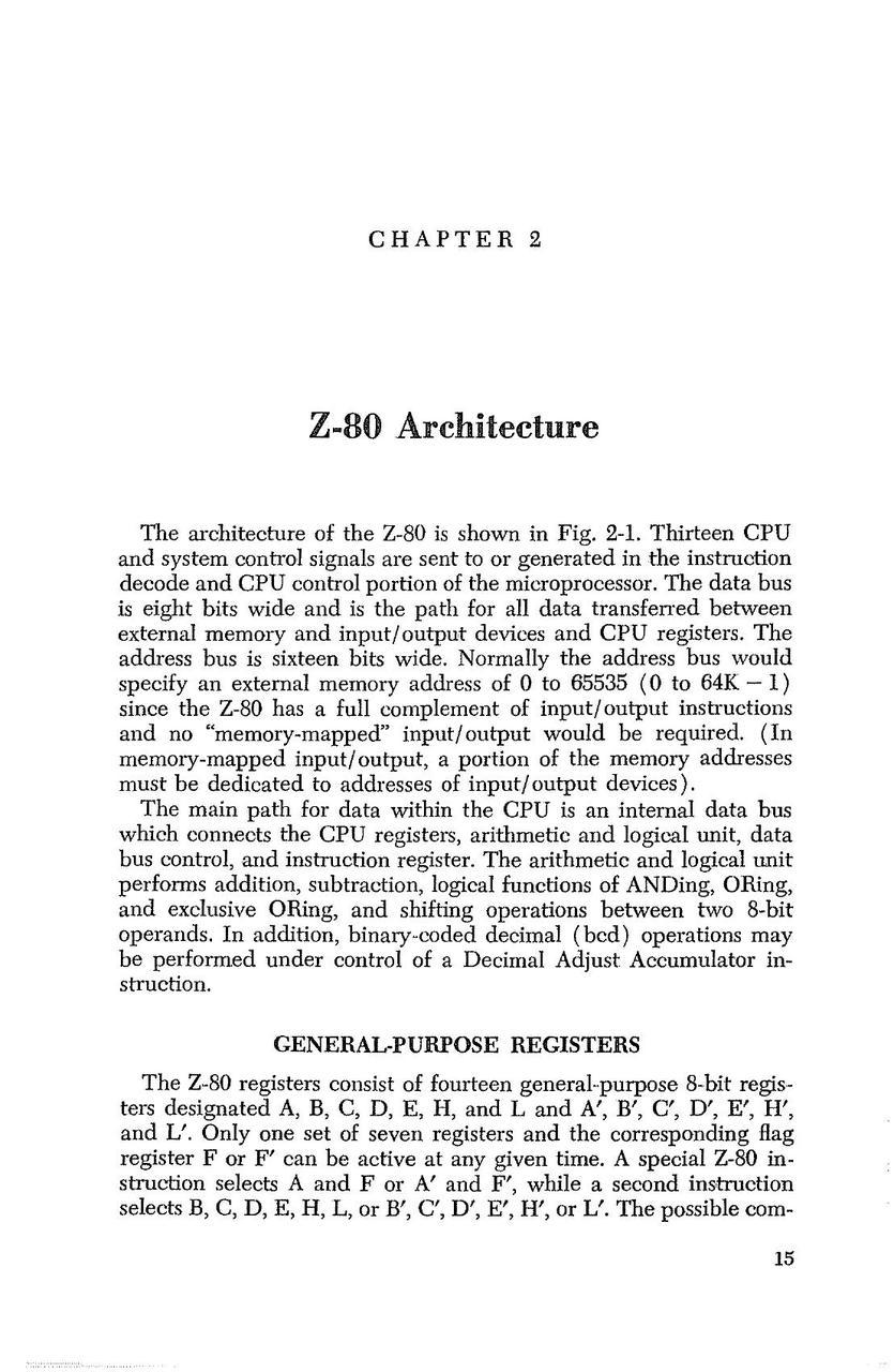 Section I opens with a concise but thorough treatment of the Z-80's internal architecture. Barden walks the reader through the processor's register set—fourteen general-purpose 8-bit registers organized in two banks (A through L, and their primed counterparts A' through L'), plus the special-purpose registers: two index registers (IX and IY), the stack pointer, program counter, interrupt vector register, and memory refresh counter.